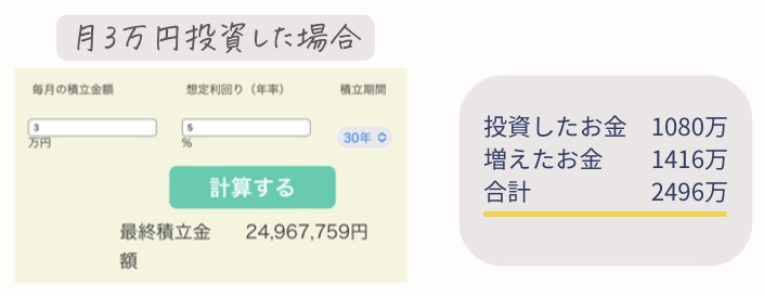 金融庁のHPでつみたてシミュレーターがあるからご自身が投資できる金額でシミュレーションしてみてね✨