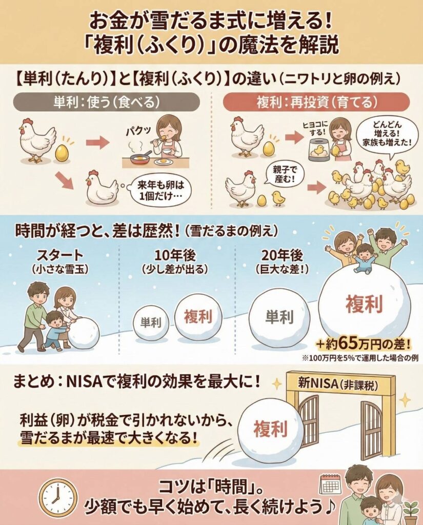 これが複利の仕組みとそっくりだから「複利の力=雪だるま式に増える」とも言われてるよ✨